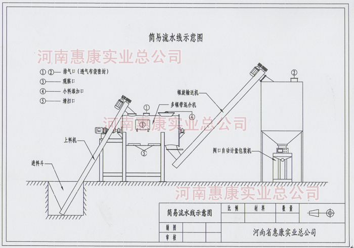 簡易型流水線主要由螺旋上料機(jī)、多螺帶混合機(jī)、二次提升機(jī)、儲料倉、閥口自動定量包裝機(jī)等組成。