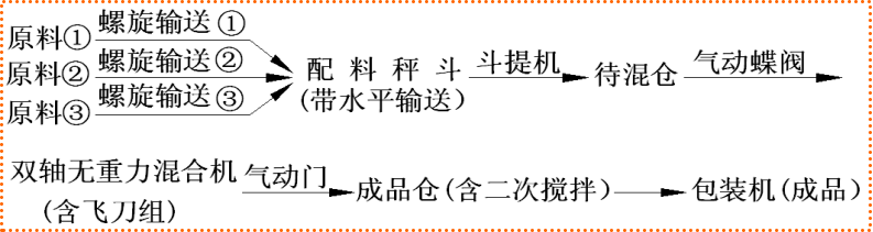 半自動生產(chǎn)線,是在節(jié)能型生產(chǎn)線基礎(chǔ)上增加待混倉改進(jìn)而成。主機(jī)由雙軸無重力混合機(jī)換成單軸多螺帶混合機(jī)。其它配套設(shè)備有:斗式提升機(jī)、成 品倉(二次攪拌)、自動定量包裝機(jī)(閥口式&敞口式)、鋼架平臺、空壓機(jī)、氣路系統(tǒng)、電氣控制柜等。