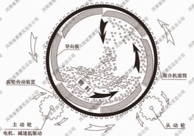 攪拌時,物料隨筒體沿逆時針方向旋轉的同時,在慣性作用下向左推移,從而達到混合目的。